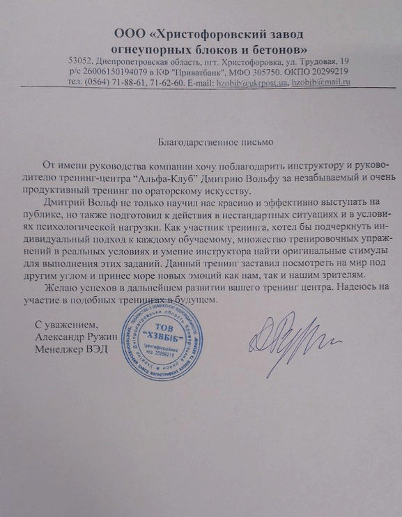 Студенты моих открытых групповых тренингов чаще всего оставляют отзывы на сайте учебного центра Альфа-Клуб, руководителем которого я являюсь. С момента открытия в 2011 году накопилось немало мнений самых разных людей. Вы можете ознакомится с ними перейдя по ссылке ниже.